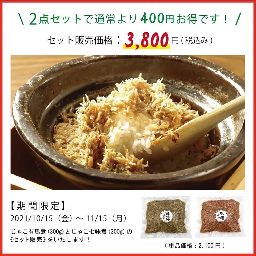 味福あさの(広尾店、店主:浅野 勝正)は、「ご自宅用じゃこ有馬煮(300g)とじゃこ七味煮(300g)」を期間限定でお得なセット販売を開始いたします。