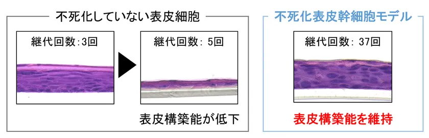 例えば、通常の表皮細胞は、培養を続けると5回程度の継代※3によって細胞老化を引き起こし、それ以上は増殖しなくなります。一方、今回樹立した表皮幹細胞モデルは、長期間培養し40回近く継代を繰り返しても、細胞老化を引き起こさず増殖を続け、さらに、表皮を構築する分化能も維持していました(図3)。
