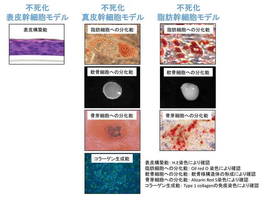 同様に、真皮幹細胞モデルや脂肪幹細胞モデルについても、長期間培養した後でも増殖能が低下せず、様々な細胞への分化能を保持していました(図4)。