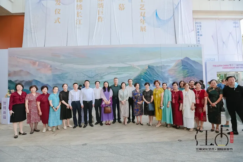 「第13回 中国刺繍文化芸術祭」の『第1回 蘇州工芸ビエンナーレ』発足式を行った後、展示場の外から巨大な蘇繍「錦繍長江」が初公開されました。「錦繍長江」は、北京建築設計研究院芸術総監、譚暁明氏が総企画を担当し、刺繍芸術家、姚建萍大師が筆頭として制作しました。長さ18メートル、高さ4.5メートルの伝統無形遺産と現代美術を組み合わせた新たな試みが収められた作品です。