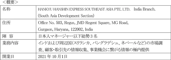 当社シンガポール現地法人であるHANKYU HANSHIN EXPRESS SOUTHEAST ASIA PTE. LTD.(以下、HHESA*)は、成長市場であるインドおよび周辺国の市場開発を行う「南アジア開発室(インド支店)」をHHESAの拠点としてデリー首都圏に開設し、南アジア地域における物流ビジネス拡大を目指します。