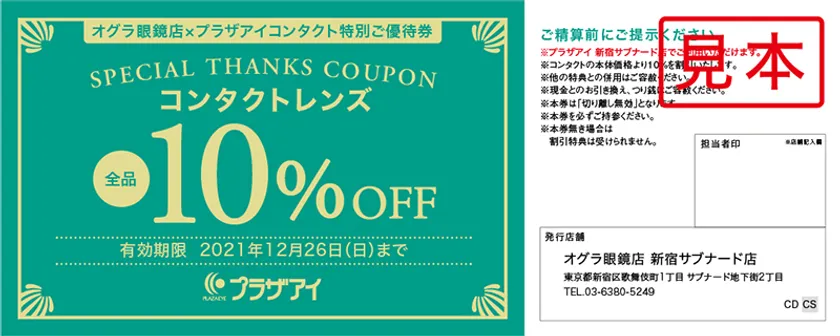 9月30日(木)~10月31日(日)の間にメガネ及び関連品ご購入の方に、プラザアイコンタクト新宿サブナード店(10月9日(土)に移転オープン予定)で使えるコンタクトレンズ10%OFFのご優待券をもれなくプレゼントいたします。