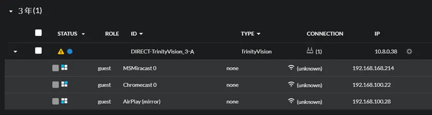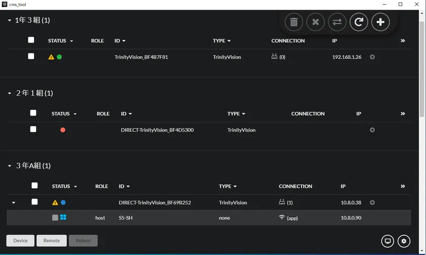 校内に設置したCMS管理PCの画面(ダッシュボード)には、トリニティービジョンの利用状態が一覧で表示されます。ダッシュボードは、学年ごとのグループに分けた設定もできます。利用中のトリニティービジョンは、ダッシュボードのステータスバーに色分けされたランプで表示されます。さらに、1台のトリニティービジョンに接続している端末情報を最大4台まで表示できます。