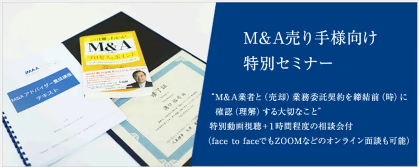 JMAAでは、“M&Aアドバイザーに依頼する前に知っておくこと”の重要性を認識いたしましたが、これらの事項まで網羅した書籍やそれに特化したセミナー等も実施されておりませんでした。このような背景から、この度、M&A売り手向け特別セミナー“M&A業者と(売却)業務委託契約を締結前(時)に確認(理解)する大切なこと”セミナーを実施する運びとなりました。