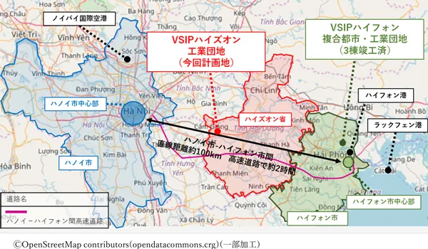本物件が立地するVSIPハイズオン工業団地は、ベトナム・シンガポール両政府の支援の下で開発が進められており、設備等のハード面が充実していることに加え、質の高いカスタマーサービスを提供していること等が、高く評価されています。また、首都ハノイ市と北部最大の港湾都市ハイフォン市を結ぶ主要幹線道路沿いに位置しており、両都市へのアクセスに優れていることから、広域物流拠点として高い優位性を持っています。