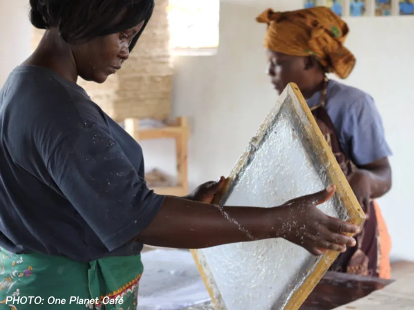 アフリカのザンビア東部・エンフエ村で収穫できるオーガニックバナナの茎の繊維と古紙を混ぜて作られる、日本ではじめてフェアトレード認証を取得した紙です。現地の人々はバナナペーパーによる収入で安全な飲み水や食事を購入でき、医療や教育が受けられるようになります。雇用が提供できるため違法な森林伐採の抑制にもなり、森林にすむ野生動物の保護に繋がり、SDGs17項目すべてに貢献できるエシカルな紙とされています。