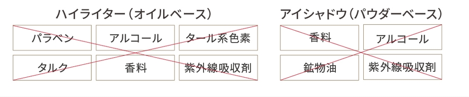 【ハイライター】パラベンフリー、アルコールフリー、タール系色素フリー、タルクフリー、香料フリー、紫外線吸収剤フリー