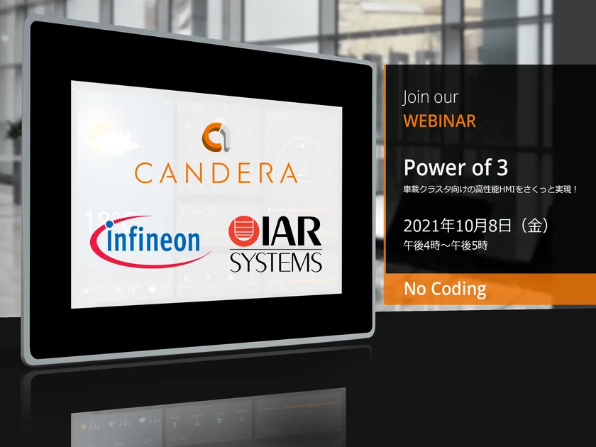 株式会社カンデラ ジャパン(東京都新宿区、代表取締役社長:Reinhard Furicht)は、10月8日(金)16時-17時にインフィニオン テクノロジーズ社(以下、インフィニオン社)とIARシステムズ社(以下、IAR社)と、「次世代HMI開発ツールで車載クラスタ向け高性能HMIをさくっと実現!」をテーマとした無料ウェビナーを共催します。最も注目のHMI開発ツール「CGI Studio」のLiveデモでは、カンデラの連載コラムの執筆を担当している開発スペシャリストが登壇し、プログラミングをすることなくHMIを開発する方法をご紹介します。