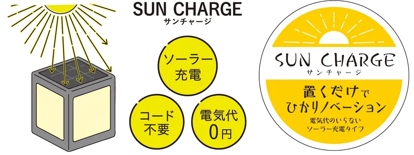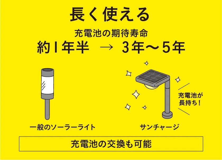 従来型ソーラーライトの場合、充電池の期待寿命が約1年半なのに対して「SUNCHARGE」は約3年~5年。しかも充電池は交換可能なのでさらに長期にわたってお使いいただけます。