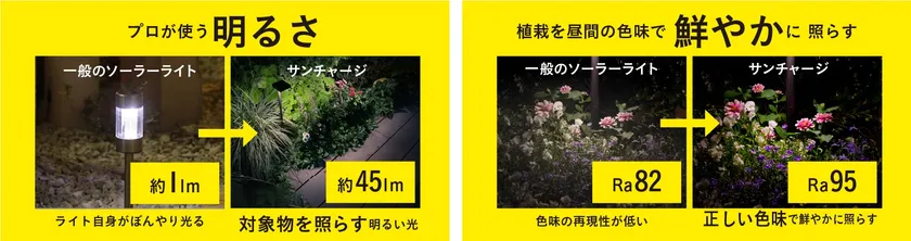 従来型ソーラーライト(当社LGS-98)の光束値が約1lmなのに対して「SUNCHARGE」は最大約45lm。足元や花壇に十分な明るさを届けます。さらに「SUNCHARGE」が採用するLEDはRa95の高演色。光の波長がより自然光に近く、本来の色合いを正しく再現できるため、花や緑を色鮮やかに照らします。