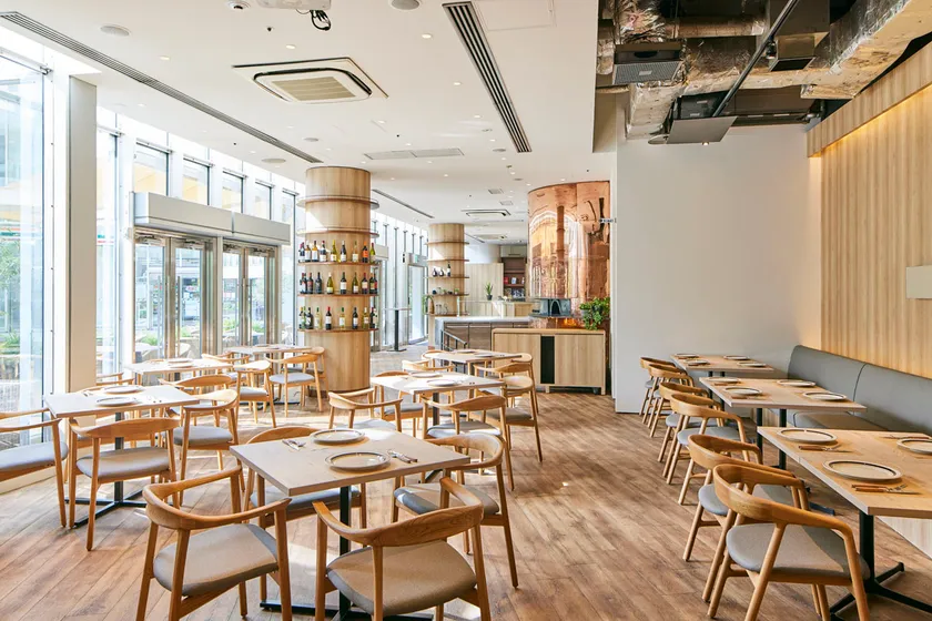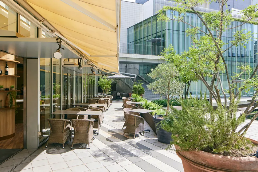 片側が一面ガラス張りの店内は、白とベージュを基調にし、自然光を惜しみなく取り込み解放的な空間を演出。ゆったりとした53席のテーブルレイアウトはプライベートな会話も邪魔をしません。また、広々としたテラス席は都心とは思えないほどリフレッシュでき、ちょっとしたお集まりでも使い勝手が抜群です。