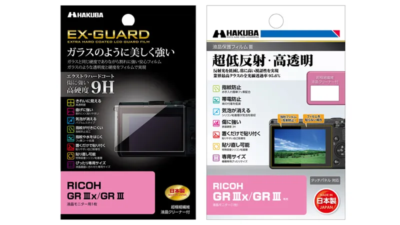 ハクバ写真産業株式会社(本社:東京都墨田区)は、ガラスと同じ硬度9Hで割れに強い「EX-GUARD」タイプと、業界最高クラスの透明度を誇る「III」タイプのデジタルカメラ用液晶保護フィルムにRICOH GR IIIx / GR III 用を追加いたします。