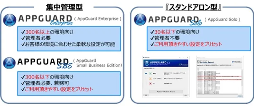 「OSプロテクト型」エンドポイントセキュリティ製品「AppGuard」は、未知・既知を問わず、高度なサイバー攻撃によるエンドポイントの侵害を未然に防止します。この技術は20年ほど前よりアメリカ国内にて開発が進められ、米政府機関等での導入実績があります。日本国内では2018年より販売が開始され、大手航空会社や大手旅行会社、大手法律事務所等において導入が進んでおり、8,000社※を超える企業に採用されています。2021年7月現在、大手企業向け「AppGuard Enterprise」、中小・中堅企業向け「AppGuard Small Business Edition」、スタンドアロン版「AppGuard Solo」のシリーズを展開しています。