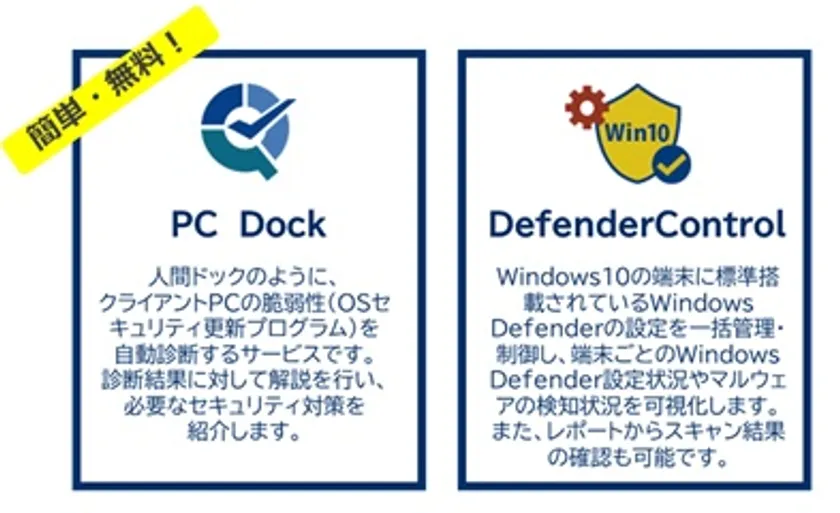 「必要な時」に「必要な対策(機能)」を選択・利用できる情報セキュリティ対策サービスです。企業が保有するPCの運用管理に必要なセキュリティ対策をクラウド上で提供します。社内・在宅勤務・海外拠点など利用環境を問わず、インターネット環境があればVPN不要で運用管理が可能です。2021年8月2日より販売を開始し、無償のクライアントPCセキュリティリスク自動診断「PC Dock」、Windows Defenderの集中管理ツール「DefenderControl」を提供しています。