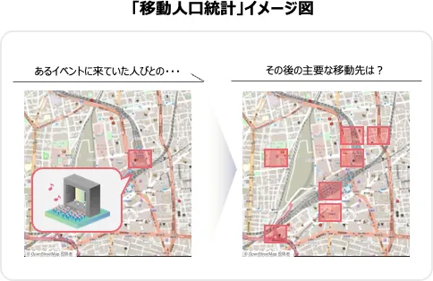 もうひとつの新技術「リアルタイム移動人口統計技術」は、ある時間帯に、あるエリアにいた人びとの主要な移動先エリアを、リアルタイムに把握することができます。この技術は、コロナ禍における人びとの移動状況を可視化することで、混雑緩和施策などへの活用も期待できます。