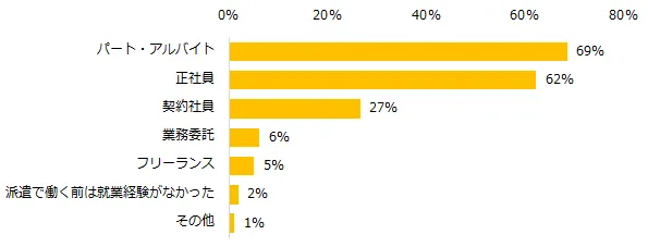 派遣で働き始める前に経験したことのある雇用形態は「パート・アルバイト」(69%)が最多。次いで「正社員」(62%)となりました。また、「派遣で働くことに興味を持ったきっかけは何ですか?」と伺ったところ、トップ3は「仕事内容を選ぶため」(36%)、「アルバイトやパートより時給が良かった」(34%)、「休日・休暇など働き方を変えるため」(30%)でした。具体的なコメントをみると、未経験から応募ができる点や職種チェンジがない点が派遣で働くことへの興味に繋がったというコメントが目立ちました。