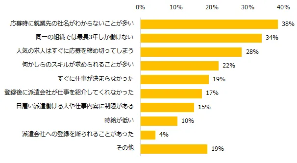 一方、「驚いたことのうちネガティブなことは何ですか?」と伺ったところ、トップ3は「応募時に就業先の社名がわからないことが多い」(38%)、「同一の組織では最長3年しか働けない」(34%)、「人気の求人はすぐに応募を締め切ってしまう」(28%)となりました。