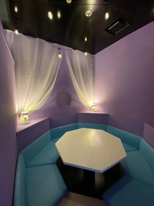 今回、新エリアのイメージを固めるに当たって、ターゲットとしている女の子たちの声をリアルに取り入れたいという思いからInstagram上でアンケートを行いました。様々な雰囲気の内装イメージから、好きなものに投票をしてもらったところ、1番人気となったのがパープルがメインカラー内装イメージ。そこで、パープルな空間をベースに、専属プロデューサーによってメイ子らしさである少し懐かしいレトロな要素や、かわいい要素を混ぜ込み、梅田店の新エリアが誕生しました。