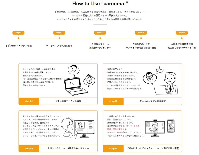 キャリマ!では、外国人を採用したい企業と日本で働きたい様々なジャンルの知識や技術を持つ外国人をスムーズにマッチングすることが出来る画期的なサービスです。