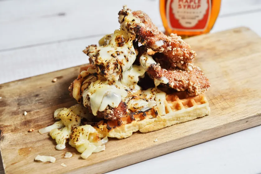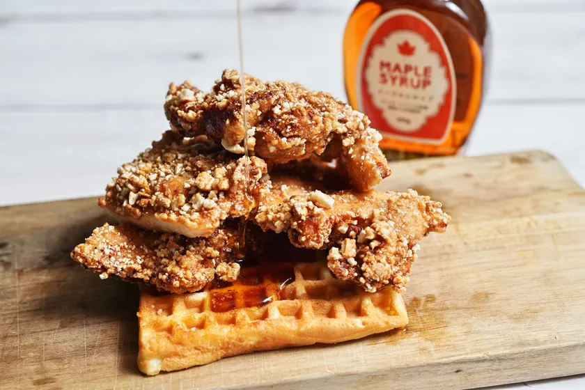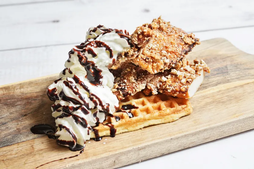 ワッフルとフライドチキンにメープルシロップをかけたワッフルチキンは、今じわじわと人気を集めています。ワッフルとメープルシロップの甘さと、フライドチキンのしょっぱさで食欲が止まらない禁断グルメです。1930年代のアメリカ・ニューヨークのハーレム地区から火が付いたといわれ、現在ではアメリカの定番メニューになっています。日本では知名度こそ低いものの、Instagramで「#ワッフルチキン」を検索すると約2.3万件の投稿があり、じわじわと人気が広がっています。そんなワッフルチキンに当店では台湾ジーパイをコラボさせました。台湾ジーパイは鶏むね肉を丸ごと1枚使ったからあげで、顔より大きいとSNSでも大人気の台湾グルメの代表格です。