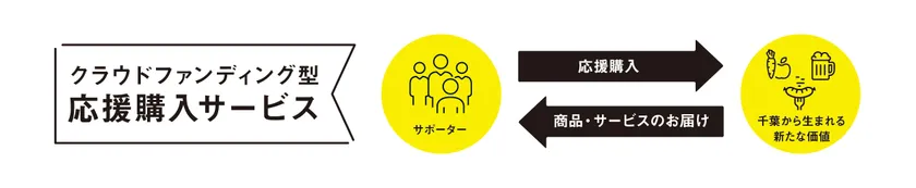 サポーターは、「C-VALUEサイト内での購入」という形で起案者を応援し、そのリターンとして商品やサービスを受け取ることができます。そして起案者は、その応援してもらった資金をもとに千葉発の新商品・新サービス・新プロジェクトの実現へ向け取り組んでいきます。