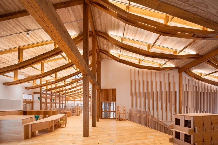 工期の分割や木材供給スケジュールに合わせた工程の設定等の工夫により、建物に使用する木材の村産材率97%を実現。健全な森林経営の推進を目指す「百年の森林構想」に基づく計画的な設計プロセスと美しいデザインを実現している。