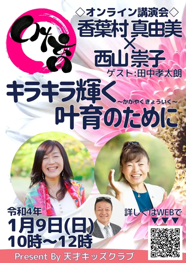 講演・研修事業を行うペップハウスにしやん(所在地:千葉県白井市、代表:西山崇子)は、人の可能性を伸ばすことができるイベント『~キラキラ輝く叶育のために~香葉村真由美×西山崇子講演会』を2022年1月9日にオンラインで行います。
