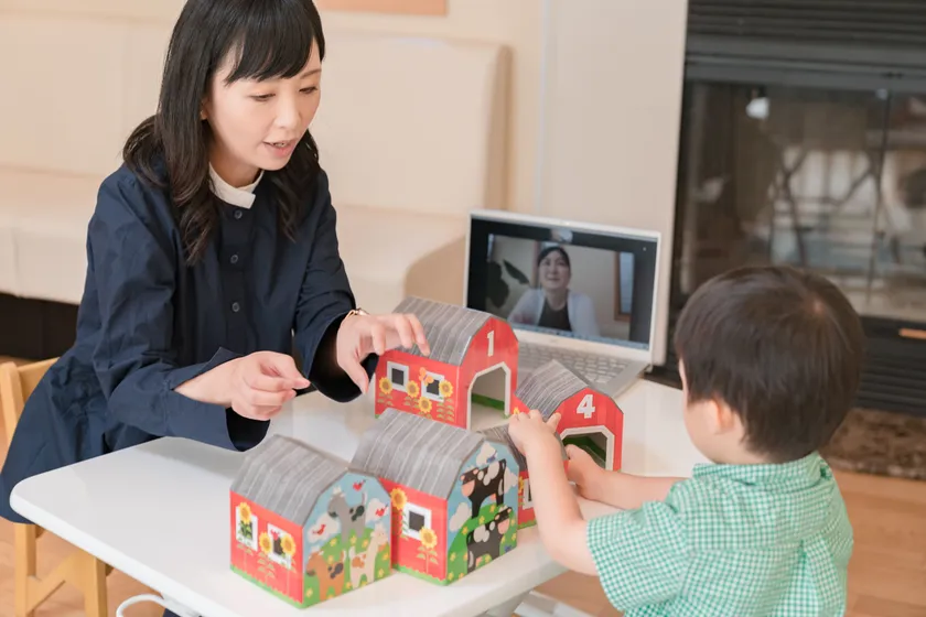 ご自宅と教室をオンライン会議システムZOOMで繋ぎ、心理士の資格を持つ職員がマンツーマンで発達支援を行います。お子様の成長を促す関わり方を習得して頂くため、ご家庭での様子を見せていただき、イヤホンマイクを通してお子様への適切な声掛けや対応を伝えます。「なにを目標にしているのか」「関わり方はどうか」などをフィードバックし、次回までの簡単なホームワークをだして、効果的な関わり方を習得できるように保護者様へのコーチングを行います。
