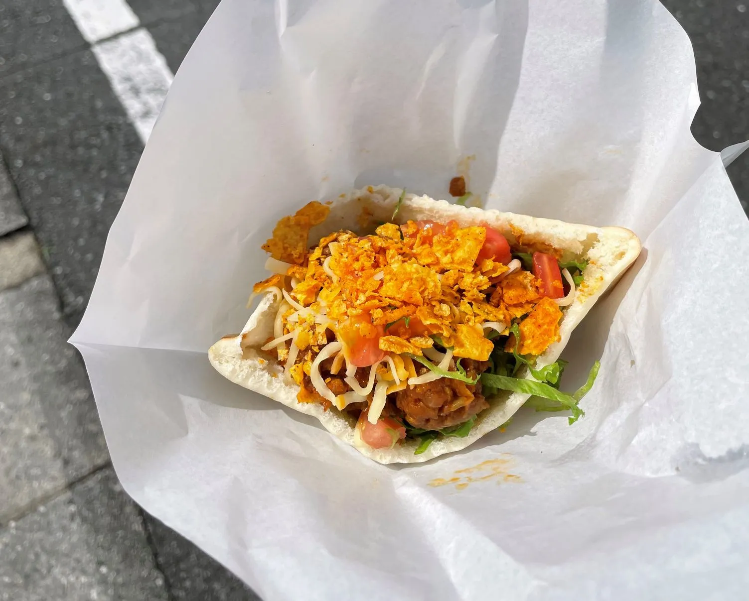 取材終わりにスパイシータコス味のピタサンドをいただきました。濃厚なタコスの味わいの中にピリッとアクセントの効いたスパイスが美味でした。これでお値段は500円と実に良心的な価格です。