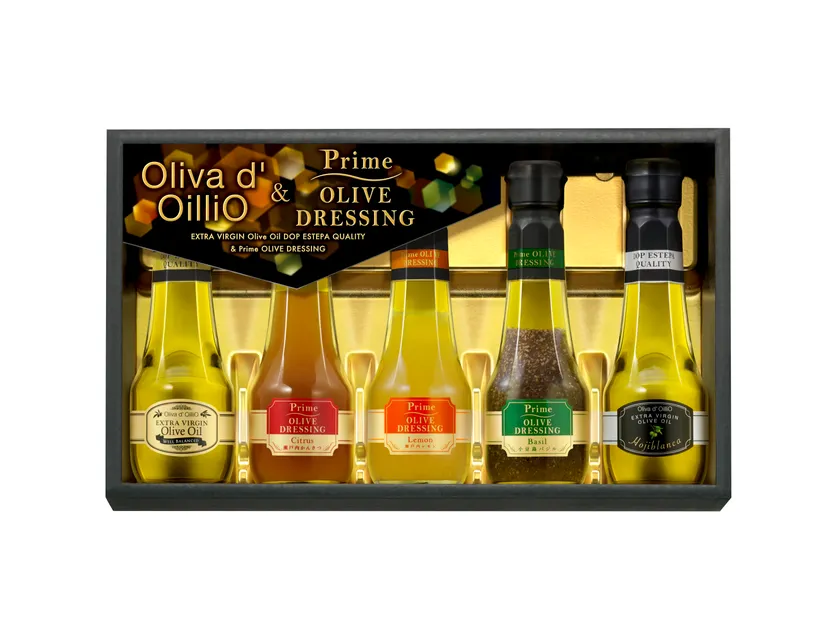 OD-30N・50Nは、バランスのとれたフルーティな味わいの「オリーバ デ オイリオ エキストラバージンオリーブオイル」と、青々とした香り・味わいの単一品種「オリーバ デ オイリオ エキストラバージンオリーブオイルオヒブランカ」の2種類のオリーブオイルに加え、爽やかな味わいの3種類のドレッシング、瀬戸内のレモンを丸ごと使用したレモン香る「プライムオリーブドレッシング瀬戸内レモン」、瀬戸内の柑橘4種の果汁を使用した「プライムオリーブドレッシング瀬戸内かんきつ」、小豆島の朝摘みバジルを使用した「プライムオリーブドレッシング小豆島バジル」を詰め合わせたバラエティ豊かなギフトです。詰め合わせに使っている2種類のオリーブオイルは、どちらもスペイン アンダルシア州産のオリーブのみを使用した産地限定オリーブオイルです。