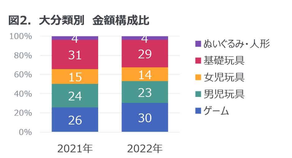 大分類別にみると、ゲームの金額伸長が玩具全体の伸びをけん引した。特に大分類ゲームに含まれるトレーディングカードは、コロナ禍の2020年以降需要が急増したが、2022年も「ポケモンカードゲーム」が好調に販売を伸ばしたことや「ワンピースカードゲーム」が新たに展開されたことで、金額が底上げされた。SNSなどで話題となることも多かった「ルービックキューブ」も、大分類ゲームのプラス成長に貢献する金額伸長がみられた。大分類ゲームが玩具全体に占める金額構成比は、前年同期から4%ポイント拡大し約3割に達した(図2)。