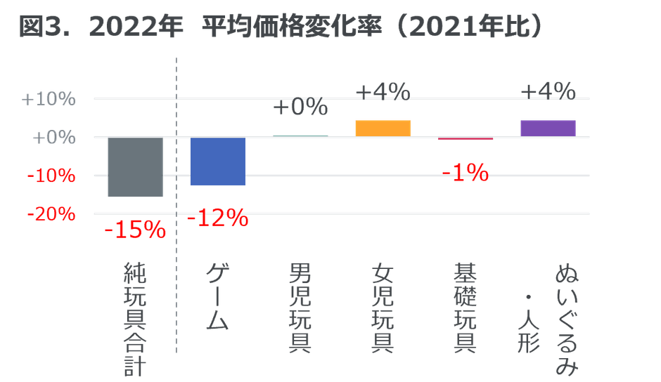 ・低単価商品構成比の高まりから、玩具全体の平均価格は前年に比べて15%低下