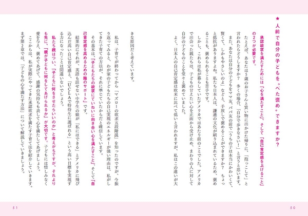 本書で紹介するのは、海外留学や受験勉強のノウハウといった偏差値一辺倒の教育法ではなく、著者が実際の子育てで培った、自己肯定感や創造力、コミュニケーション力などの「非認知能力」を育むメソッドです。