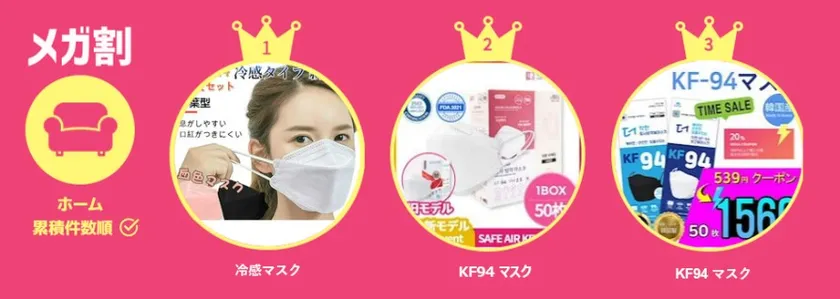ホームカテゴリーでは、1位から3位をマスクが占めました。メガ割のお得な時期にこそ、消耗品の日用雑貨を購入する方が多く、なかでも今や必須アイテムとして生活に手放せなくなったマスクを大量買いしたようです。