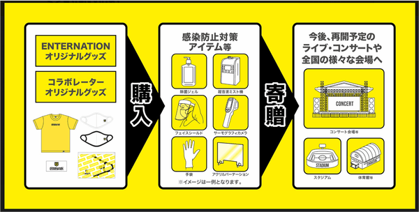 ENTERNATION PROJECTとは、このような現実に打開策を講じてコロナ禍で未だ先行きの見えないエンタメ業界を応援するために立ち上げたプロジェクトです。イベント、ライブ、コンサート再開に向けて、オリジナルグッズの製作販売及び、様々なジャンルの著名人の方々とコラボレーショングッズを製作販売し、この収益金(製造費や送料及び諸経費を除く)を、今後再開予定の活動等における、感染防止対策費用の資金としてお使いいただける企画です。また、同時に収益金の一部をENTERNATION基金としてもデポジットさせていただき、厳正なる審査で寄贈先を選定の上、感染防止アイテムを寄贈してまいります。ここでしか買えない様々なコラボレーターのグッズをご購入いただくことで、ライブエンタメ業界を応援してください。今後も様々なコラボグッズを製作していく予定ですので、随時コラボレーターも募集しております。