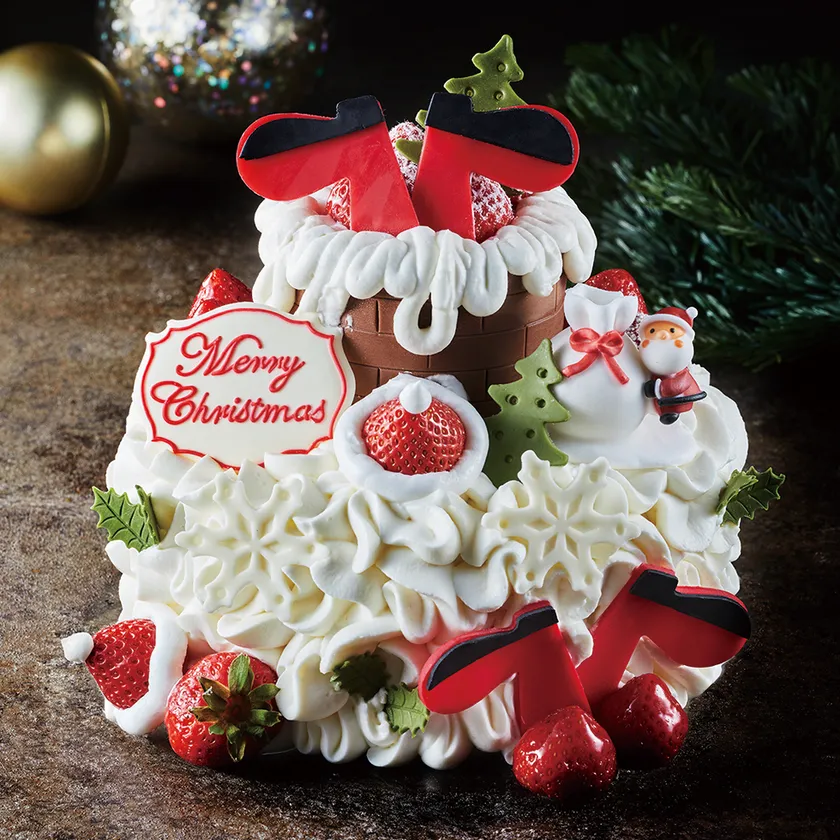 思わず笑顔があふれだす、サンタクロースが煙突から入る様子が楽しげなクリスマスケーキです。自慢のショートケーキの上に煙突に見立てたチョコレートケーキをのせ、ふたつの味が一度に楽しめるにぎやかなパーティーにぴったりの2段仕立て。ふんわりと焼き上げたキメの細かいスポンジ生地の食感と、甘さ控えめでコクがある口溶けの良い生クリームの絶妙なハーモニーをご堪能いただけます。