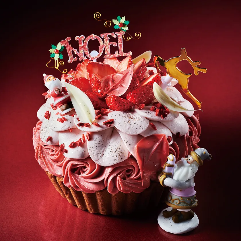 魔法使いがクリスマスケーキにそっと笑顔の魔法をかけてお届けします。なめらかで濃厚なチーズタルトに、甘みと酸味のあるローズ色の濃厚なストロベリークリームと、羽のような淡いピンク色のやさしいストロベリー味生クリームの2種類のクリームをたっぷり絞りました。それぞれのクリームを味わったあとはミックスして、味の変化をお楽しみください。
