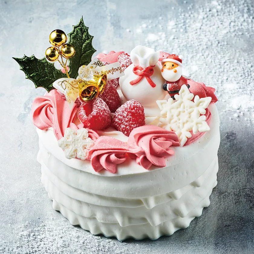 酸味と甘みのバランスがよいストロベリークリームをクリスマスリースに見立てて絞り、抱えきれないほどのプレゼントを運ぶキュートなサンタクロースを飾りました。ケーキの土台はキメ細かくふんわり食感のスポンジと、口溶けなめらかな生クリームの味わいをそのまま冷凍でお届けする自慢のショートケーキです。仕上げにラズベリーを飾り付けました。
