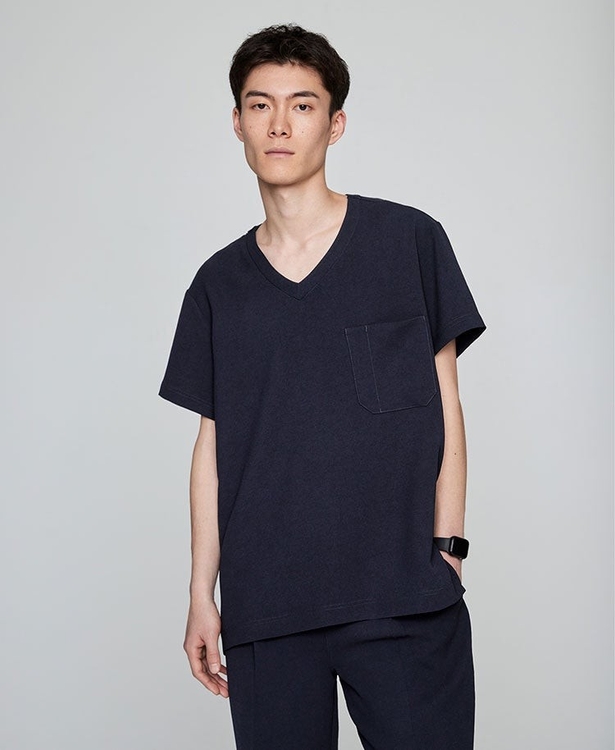 落ち感が美しい素材を活かしたリラクシングなデザイン。トップスはデザイン性と着心地を両立するドロップショルダーにしました。肩ボタン・腰元のポケットをなくし、携帯性を高めています。胸ポケットにはペンがすっきり収まる仕切りステッチを配置しました。