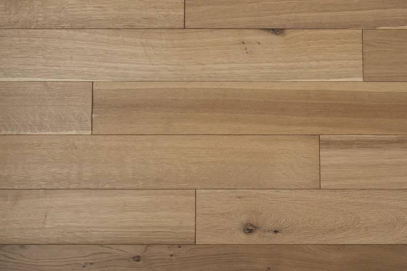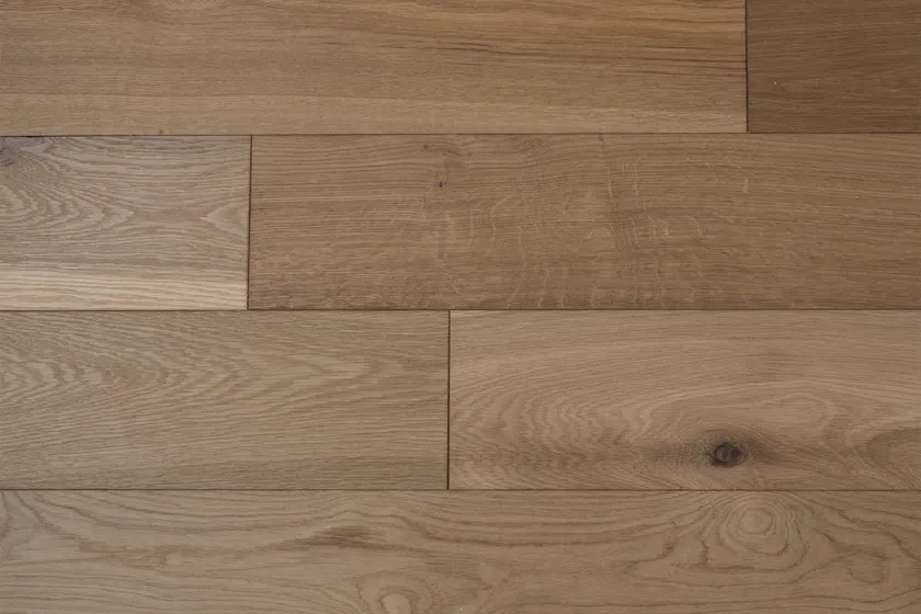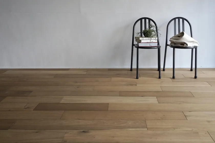 燻蒸処理とは本来、主に着色で仕上げるフローリングを製造する際、木の色味を抜くために行われる下地処理です。元々のオークの板の個体差はそのままに、新材特有の黄味や赤味が抜けた風合いが、目指していた「渋み」のイメージと合致。通常はこの工程の後に着色をして仕上げるものを、そのまま活かして製品化しました。