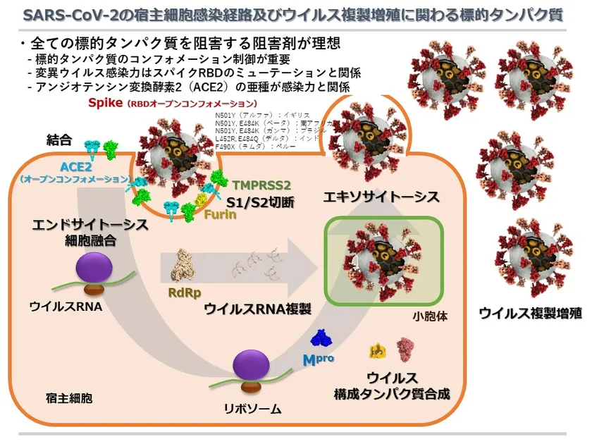 II型膜貫通型セリンプロテアーゼ(TMPRSS2):人の細胞表面に存在するタンパク質(酵素)で、カモスタットが結合して阻害活性を示し、SARS-CoV-2の感染を抑制することが早くから知られている。ウイルス表面のスパイクタンパク質のRBD領域を切断して、ウイルスの人細胞内への感染を許してしまうため、TMPRSS2の阻害剤が新型コロナウイルスの感染を抑制することが分かっている。