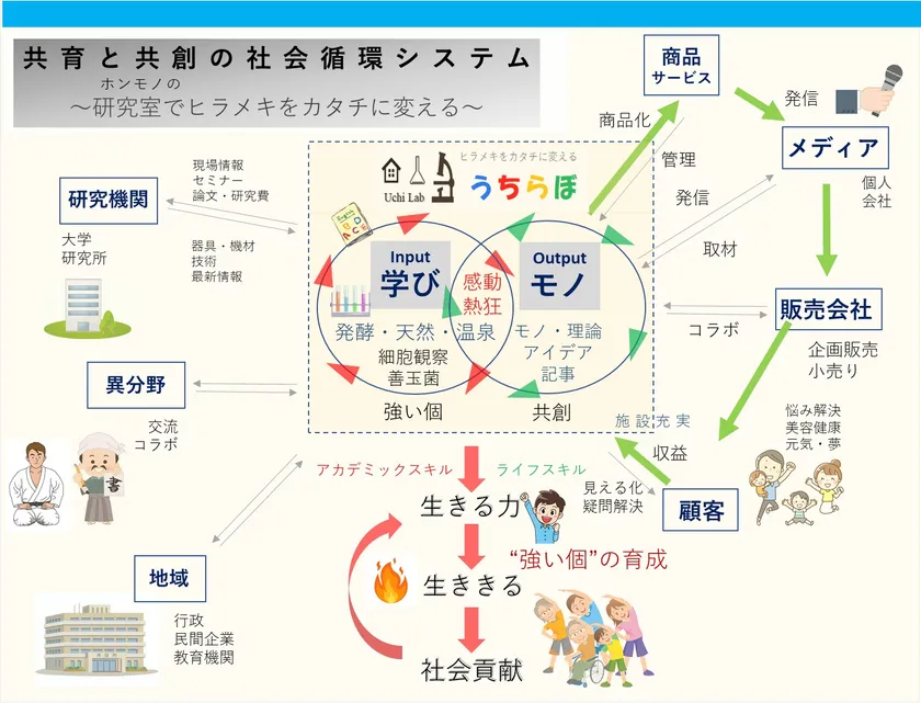 当社は、新たに立ち上げたバイオラボで年齢や専門分野を超えて、学び(インプット)と創出(アウトプット)を繰り返す活動を始めました。積極的に外部企業と共同研究や共同開発を行い収益につなげることで、体験型の学び場である研究施設を発展させる社会循環を創ります。B-bizジャーナル「イノベータ湯」で紹介されましたのでご参照ください。