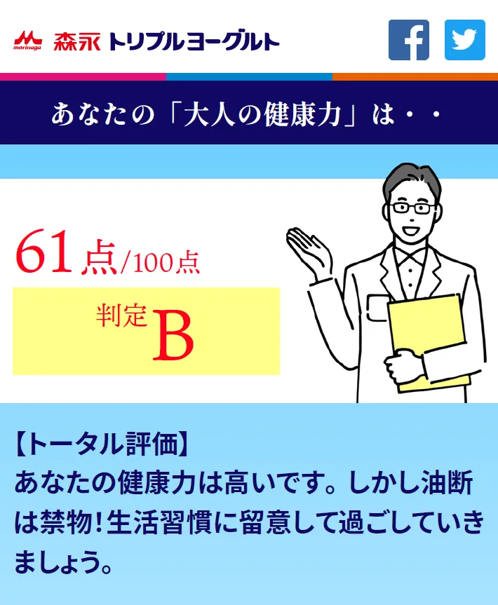 今回、「全国一斉大人の健康力診断」のお話をいただき、簡単な質問に回答するだけで判定結果が出るということで興味津々で入力してみました。