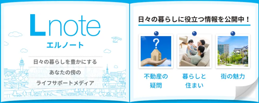 「Lnote(=Livable note)」はその名の通り、ノートのように「いつでもあなたの傍に置いていただける身近な存在であり続けたい」という願いのもと、様々なお役立ち情報をお届けするライフサポートメディアです。住まいに関する情報や街の魅力紹介等、気軽にお読みいただける内容から、不動産に関する税金や相続、投資等、専門的な内容まで幅広いコンテンツを取り揃えています。将来の不動産購入や売却に向けて知識を蓄えておきたい方や、現在不動産の購入や売却を検討されている方等、多くの方々の様々なニーズにお応えするサイトとなっています。