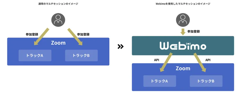 Webimoは、オンラインウェビナーツールとして優秀なZoom Webinarを活用しつつ、Zoom単体では補いきれない機能を補完して、スマートなイベント運営を行うことが出来るようにするオンラインカンファレンスサービスです。