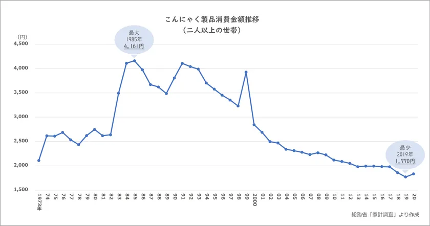 こんにゃくは、低カロリーで糖質、脂質はゼロ、食物繊維も豊富なダイエットには欠かせない日本の伝統食材です。しかし煮物など調理を前提とした食材のため、共働き世帯の増加、簡便志向を背景に、こんにゃくの支出金額は最も高い1985年の4,161円を100%として、増加と減少の変動を繰り返し、1999年を境に年々減少傾向をたどり、2019年には1,770円と35年間で43%まで減少しております。