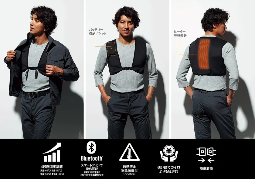 上からジャケットを羽織ったり、セーターの下に着込んだり、自由にアウターを選ぶことが出来、屋外の作業以外でも、スーツを着たデスクワークやウインタースポーツなど様々な場面で利用可能になっています。