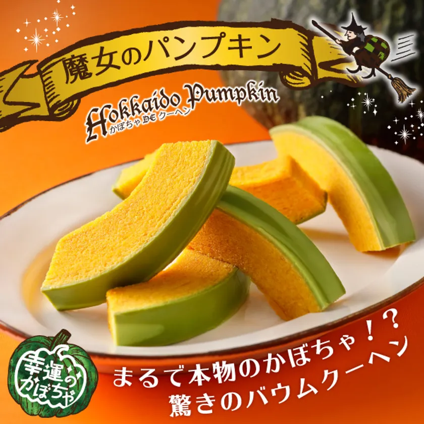 毎年、大人気!ハロウィン限定「魔女のパンプキン」は、まるで本物のかぼちゃのような驚きのバウムクーヘンです。まわりのチョコレートもかぼちゃの皮に見えるよう、本物のかぼちゃと見比べながら、何度も色合いや仕上げを試行錯誤して完成に至りました。もちろん見た目だけでなく、かぼちゃの旨味・甘味を幾重にも重ねた、しっとりと食べ応えのある味わい。北海道を代表するバウムクーヘン「三方六」の柳月から、ちょっと変わったバウムクーヘン「魔女のパンプキン」をお届けします。