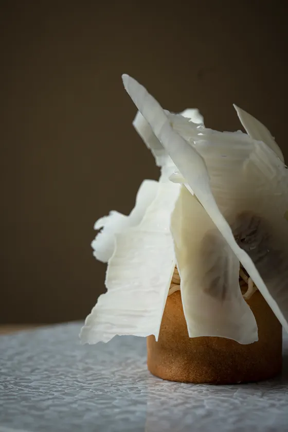 筒状の薄いクッキー生地の中にオリジナルのマロンクリームを絞り、栗の渋皮煮をアクセントに。その上に丹波栗を使用したモンブランクリームをカウンターの目の前で絞り、ホワイトチョコレートで斬新に仕上げます。和栗の芳醇で濃厚な味わいをお楽しみ頂けます。