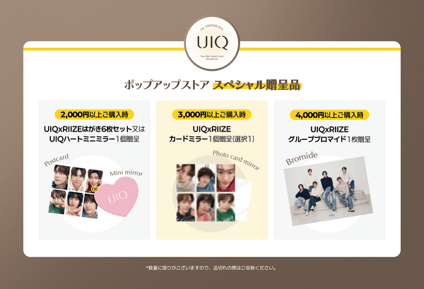 本イベントでは、UIQの新商品からベストセラーまでお試しいただけるブース をはじめ、さまざまな企画をご用意。また、専属モデルであるRIIZEのメンバー※等身大パネルと写真が撮れる撮影ブースも登場いたします。ここでしか体験できない特別イベントや購⼊特典もご用意しておりますので、この機会にぜひご来場ください!